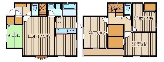 | 築年月 | 2022年4月 | 間取り | 3SLDK( LDK17.5畳(1階)/洋室6畳(2階)/洋室5.4畳(2階)/洋室6畳(2階)/S3畳(1階) ) | 専有面積 | 91.91m2 |