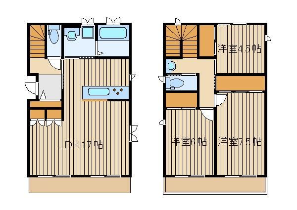 築年月 2025年9月  間取り 3LDK( 洋室7.5畳(2階)/洋室6畳(2階)/洋室4.5畳(2階)/LDK17畳(1階) ) 専有面積 87.15m2